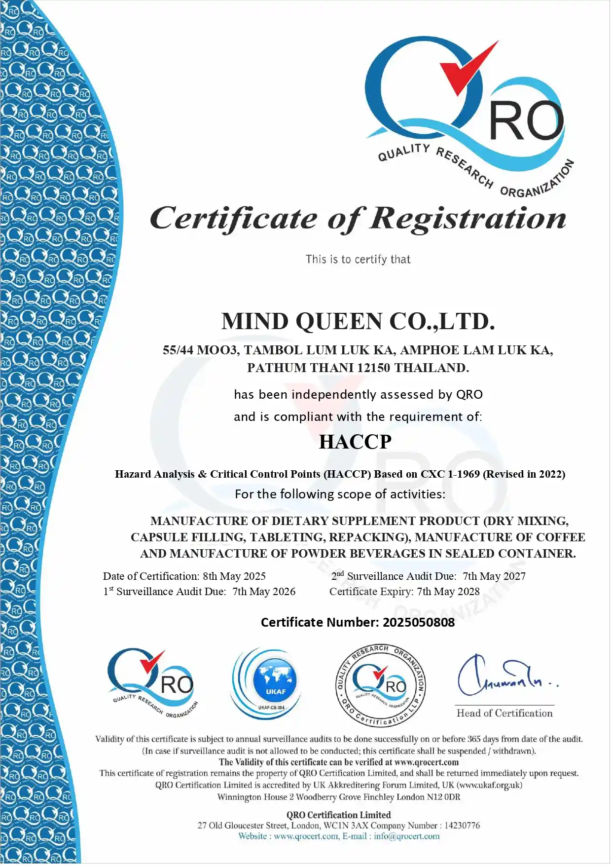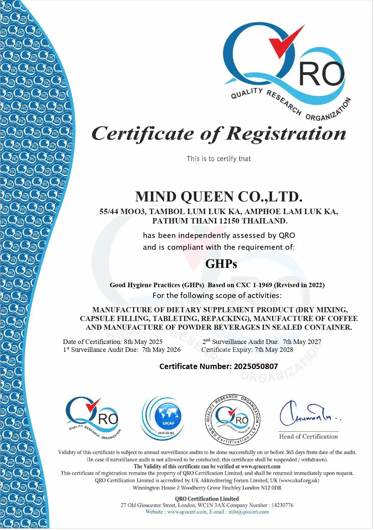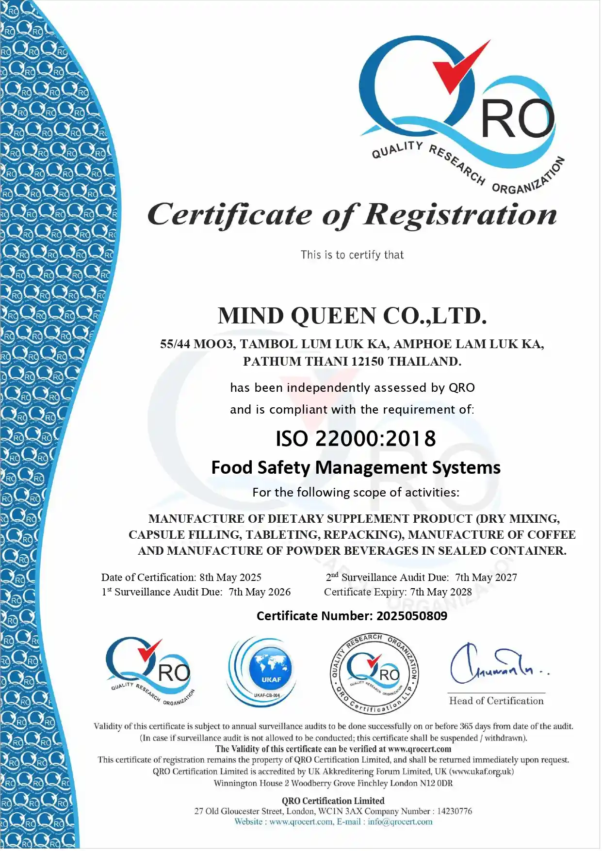 – ISO 22000 : 2018 Food Safty Management System – Hazard Analysis & Critical Control Points (HACCP) – Good Hygiene Practices (GHPs) – Department of Business Development
